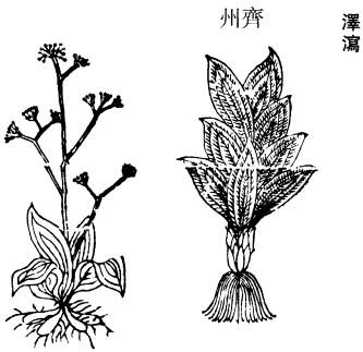 《图经》云:泽泻,生汝南池泽,今山东、河、陕、江、淮亦有之,以汉中者为佳。春生苗,多有浅水中,叶似牛舌草,独茎而长。秋开白花,作丛似谷精草。五月、六月、八月采根,阴乾。《素问》身热解堕,汗出如浴,恶风少气,名曰酒风。治之以泽泻、术各十分,麋衔五分,合以二指撮,为后饭。后饭者,饭后药先,谓之后饭。张仲景治杂病,心下有支饮,苦冒,泽泻汤主之。泽泻五两,术二两,水二升,煎取半升,分温再服。治伤寒有大、小泽泻汤,五苓散辈,皆用泽泻,行利停水为最。