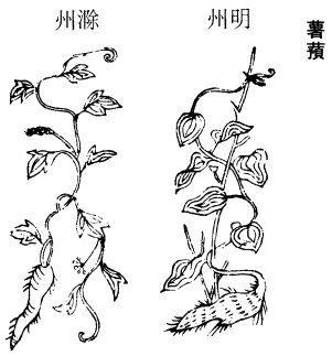 《图经》曰:北都、四明者为佳。春生苗,蔓延篱援。茎紫色叶青,有三尖角似牵牛更厚而光泽。郭璞注云:根似芋可食。今江南人单呼诸,语或有轻重耳。据此注,则薯蓣与诸乃一种。南北之产或有不同,故其形类差别。然字音殊、储不同,盖相传之讹也。一名山芋。