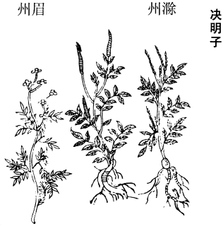 《衍义》曰:决明子,苗高四五尺,春亦为蔬。秋深结角,其子生角中如羊肾。今湖南、北人家园圃所种甚多,或在村野或成段种。《蜀本图经》曰:叶似苜蓿而阔大,甚为允当。