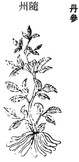 《图经》曰:丹参,生桐柏山川谷及太山,今陕西、河东州郡及随州亦有之。二月生苗,高一尺许。茎簳方棱,青色。叶生相对,如薄荷而有毛。三月开花,红紫色似苏花。根赤大如指,长亦尺余,一苗数根。五月采,暴乾。又云:冬月采者良,夏月采者虚恶。