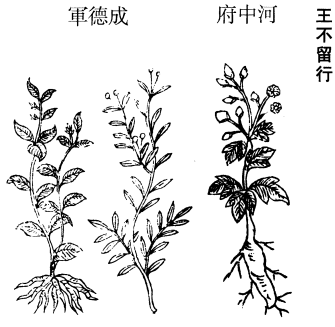 《图经》曰:王不留行,生太山山谷,今江浙及并河近处皆有之。苗茎俱青,高七八寸已来。根色黄如荠根,叶尖如小匙头,亦有似槐叶者。四月开花,黄紫色,随茎而生,如菘子状,又似猪蓝花。五月内采苗茎,晒乾用。俗间亦谓之剪金草。河北生者,叶圆花红,与此小别。张仲景治金疮,八物王不留行散,小疮粉其中,大疮但服之,产妇亦服。《正元广利方》疗诸风痉,有王不留行汤最好。