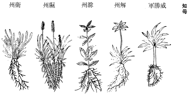 《图经》曰:知母,生河内川谷,今濒河诸郡及解州、滁州亦有之。根黄色,似菖蒲而柔润。药1至难死,掘出随生,须燥乃止。四月开青花,八月结实。二月、八月采根,暴2干用。