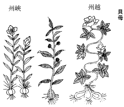 《图经》曰:贝母生晋地,今河中、江陵府、郢、寿、随、郑、蔡、润、滁州皆有之。根有辨5子,黄白色,如聚贝子,故名贝母。二月生苗,茎细青色,叶亦青,似荞麦,叶随苗出。七月开花碧绿色,形如彭6子花。八月采。又云:四月蒜熟时采之良。此药亦治恶疮。唐人记其事云:江左尝有商人,左膊上有疮,如人面,亦无他苦。商人戏滴酒口中,其面亦赤色。以物食之,亦能食,食多则觉膊内肉胀起。或不食之,则一臂痹。有善医者,教其历试诸药,金石草木之类,悉试之无苦,至贝母,其疮乃聚眉闭口,商人喜曰:此药可治也。因以小苇筒毁其口灌之,数日成痂,遂愈,然不知何疾也。