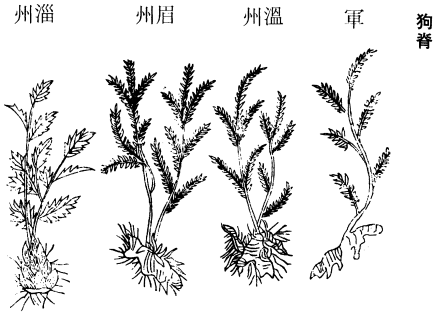《图经》曰:狗脊,生常山川谷,今太行山、淄、温、眉州亦有。根黑色,长三四寸,两指许大,苗尖细碎,青色,高一尺已来,无花。其茎、叶似贯众而细,其根长而多歧,似狗脊骨,故以名之。其肉青绿,春秋采根,暴乾用。今方亦用金毛者。