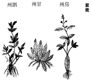 味辛,温,无毒。主女人漏下赤白,血闭,阴肿,寒热,风头侵目泪出,长肌肤,润泽,可作面脂,疗风邪,久渴,吐呕,两胁满,风痛,头眩目痒。可作膏药、面脂,润颜色。一名芳草,一名白茞,一名嚣(许骄切),一名莞,一名苻蓠,一名泽芬。叶名蒚(音历)麻,可作浴汤。生河东川谷下泽。二月、八月采根,曝乾。当归为之使,恶旋复花。