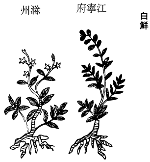 《图经》曰:白芷,生河东川谷下泽,今所在有之,吴地亦9多。根长尺余,白色,粗细不等,枝干去地五寸已上。春生叶,相对婆娑,紫色,阔三10指许。花白微黄。入伏后结子,立秋后苗枯。以黄泽者为佳。