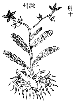 《药性论》云:射干,使,有小毒。能治喉闭,水浆不入,能通女人月闭,治疰气,消瘀血。