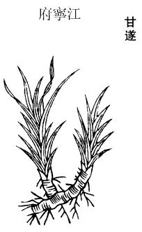 味苦、甘,寒、大寒,有毒。主大腹疝瘕腹满,面目浮肿,留饮(音癊)宿食,破癥坚积聚,利水谷道,下五水,散膀胱留热,皮中痞,热气肿满。一名甘藁,一名陵藁,一名凌泽,一名主田。生中山川谷。二月采根,阴乾。瓜蒂为之使,恶远志,反甘草。