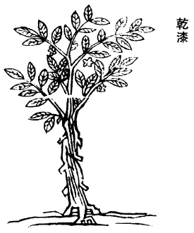 《图经》曰:乾漆、生漆,出汉中川谷,今蜀、汉、金、峡、襄、歙州皆有之。多高三二丈,皮白,叶似椿,花似槐子一若牛李,木心黄。六月、七月以竹筒钉入木中取之。崔豹《古今注》曰:以刚斧斫其皮开,以竹管承之,汁滴则成漆是也。乾漆,旧云用漆桶中自然乾者,状如蜂房,孔孔隔者。今多用筒子内乾者,以墨如䃜,坚若铁石为佳。《华佗传》:彭城樊阿,少师事佗,求服食法。佗授以漆叶青黏散方,云服之去三虫,利五脏,轻身益气,使人头不白。阿从其言,年五百余岁。漆叶所在有之。青黏生於丰沛、彭城及朝歌。一名地节,一名黄芝。主理五脏,益精气。本出於迷人入山者,见仙人服之,以告佗,佗以为佳,语阿,阿秘之。近者人见阿之寿而气力强盛,怪之,以问所服食,阿因醉乱误说,人服多验。