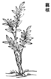 《图经》曰:蕤核,生函谷川谷及巴西,今河东亦有之。其木高五七尺,茎间有刺。叶细似枸杞而尖长,花白,子红紫色,附枝茎而生,类五味子。六月成熟,五月、六月采实,去核壳阴乾。刘禹锡《传信方》所著法最奇,云:眼风泪痒,或生翳,或赤眦,一切皆主之。宣州黄连捣筛末,蕤核人去皮碾为膏,缘此性稍湿,末不得故耳。与黄连等分和合,取无蚛病乾枣三枚,割头少许留之却核,以二物满填於中,却取所割下枣头,依前合定,以少绵裹之,惟薄绵为佳。以大茶碗量水半碗,於银器中,文武火煎取一鸡子以来,以绵滤,待冷点眼,万万不失。前后试验数十人皆应,今医家亦多用得效,故附之。
