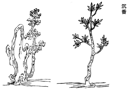 《图经》曰:沉香、青桂香、鸡骨香、马蹄香、煎香同是一本。旧不著所出州土,今惟海南诸国及交、广、崖州有之。其木类椿、榉,多节,叶似橘,花白。子似槟榔,大如桑椹,紫色而味辛。交州人谓之蜜香。若欲取之,先断其积年老木根,经年其外皮干俱朽烂,其木心与枝节不坏者即香也。细枝紧实未烂者,为青桂。坚黑而沉水者,为沉香。半沉半浮与水面平者,为鸡骨。最粗者,为煎香。又云:沉香中形如鸡骨者,为鸡骨香。形如马蹄者,为马蹄香。然今人有得沉香奇好者,往往亦作鸡骨形,不必独是煎香也。其又粗不堪药用者为生结黄熟香。其实一种,有精粗之异耳。并采无时。又薰陆香,形似白胶,出天竺、单于二国。《南方草木状》如薰陆出大秦国,其木生於海边沙上,盛夏木胶出沙上,夷人取得,卖与贾客,乳香亦其类也。