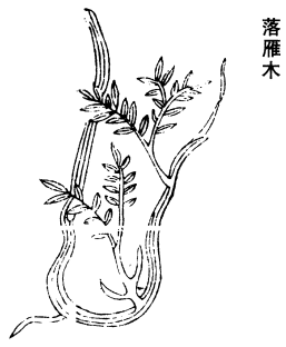 谨按徐表《南州记》云:生南海山野中。藤蔓而生,四面如刀削,代州雁门亦有。藤萝高丈余,雁过皆缀其中,故曰落雁木。又云:雁衔至代州雁门,皆放落而生,以此为名。蜀中雅州亦出。味平、温,无毒。主风痛伤折,脚气肿,腹满虚胀。以粉木同煮汁蘸洗,并立效。又主妇人阴疮浮疱。以椿木同煮之,妙也。