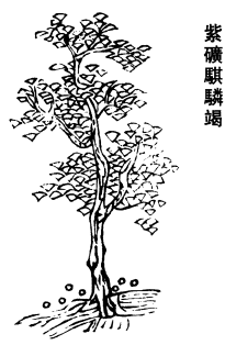 《图经》曰:骐驎竭,旧不载所生州土,今出南蕃诸国及广州。木高数丈,婆娑可爱。叶似樱桃而有三角。其脂泪从木中流出,滴下如胶饴状,久而坚凝乃成竭,赤作血色,故谓之血竭。采无时。其味咸而气腥者,是海母血,不可用。真竭微咸而甘,作栀子气味。旧说与紫矿大都相似,而别是一物,功力亦殊。今按段成式《酉阳杂俎》云:紫矿出真腊国,国人呼为勒佉。亦出波斯国。木高丈许,枝干繁郁,叶似橘柚,冬不凋落。三月花开,不结子。每有雾露微雨沾濡其枝条,则为紫矿。