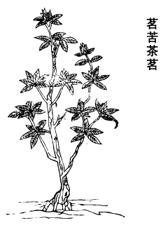 《唐本》注云:《尔雅•释木》云:槚,苦茶。注:树小似栀子。冬生叶,可煮作羹饮。今呼早采者为茶,晚取者为茗,一名荈,蜀人名之苦荼。生山南汉中山谷。