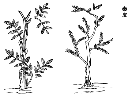 《图经》曰:秦皮,生庐江川谷及冤句,今陕西州郡及河阳亦有之。其木大都似檀,枝干皆青绿色。叶如匙头许大而不光。并无花实,根似槐根。二月、八月采皮,阴乾。其皮有白点而不粗错,俗呼为桪木。取皮渍水便碧色,书纸看之青色,此为真也。