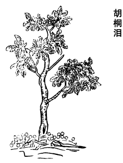 《图经》曰:胡桐泪,出肃州以西平泽及山谷中,今西蕃亦有商人货之者。相传其木甚高大,皮似白杨、青桐辈。其叶初生似柳,渐大则似桑、桐辈。其津液沦入地中,与大石相著,冬月采得之,状如黄矾、姜石,味极咸苦,得水便消,如消石也。古方稀用,今治口齿家为最要之物。一名胡桐律。律、泪声近也。然有一种木律极相类,不堪用也。