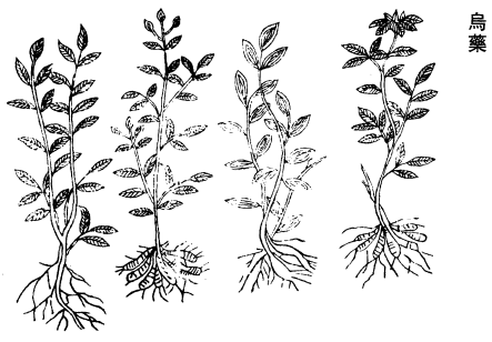 《图经》曰:乌药,生岭南邕、容州及江南,今台州、雷州、衡州亦有之,以天台者为胜。木12似茶槚,高五七尺。叶微圆而尖,作三桠,面青背白。五月开细花,黄白色。六月结实如山芍药。而有极粗大者,又似钓樟根。然根有二种:岭南者,黑褐色而坚硬;天台者,白而虚软,并八月采。根以作车毂形如连珠状者佳。或云:天台出者香白可爱,而不及海南者力大。