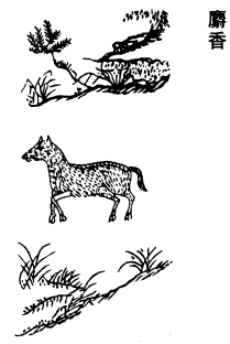 《图经》曰:麝香,出中台山谷及益州、雍州山中,今陕西、益、利、河东诸路山中皆有之,而秦州、文州诸蛮中尤多。形似獐而小,其香正在阴前皮内,别有膜裹之。春分取之,生者益良。此物极难得真。蛮人采得,以一子香,刮取皮膜,杂肉余物、裹以四足膝皮,共作五子。而土人买得,又复分揉一为二三,其伪可知。惟生得之,乃当全真耳。蕲、光山中,或时亦有,然其香绝小,一子才若弹丸,往往是真香,盖彼人不甚能作伪耳。