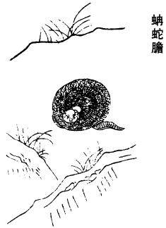 《唐本》注云:蛇屎,疗痔瘘,器中养取之。皮灰,疗疔肿,恶疮,骨疽。蜕皮,主身痒、瘑、疥、癣等。蝮蛇作地色,鼻反,口叉长,身短,头尾相似,大毒,一名蚖蛇,无二种也。山南汉沔间多有之。