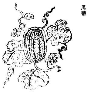 《图经》曰:瓜蒂,即甜瓜蒂也。生嵩高平泽,今处处有之,亦园圃所莳。旧说瓜有青、白二种,入药当用青瓜蒂,七月采,阴乾。方书所用,多入吹鼻及8吐膈散中。茎亦主鼻中息肉,齆鼻等。叶主无发,捣汁涂之即生。花主心痛,咳逆。肉主烦渴,除热,多食则动痼疾。又有越瓜,色正白,生越中。胡瓜黄色,亦谓之黄瓜,别无可用,食之亦不益人,故可略之。