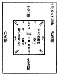 玄冥正炁,湛湛清波。下有灵龟,吞邪食魔。荡濯尘垢,炁炁冲和。育我元精,上升大罗。右四灵,并按方色,用缯成旛,各长三尺六寸,朱书符,立各方。
