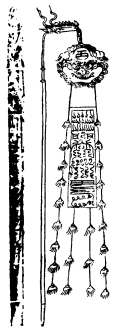 右辟邪节,用枫木刻狮头,装彩色如仪。次用青绢长三尺六寸,阔一尺五寸,泥金书符。四畔用银铃二十四枚,给以黄线朱绂。
