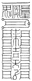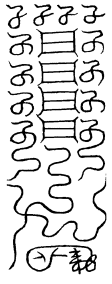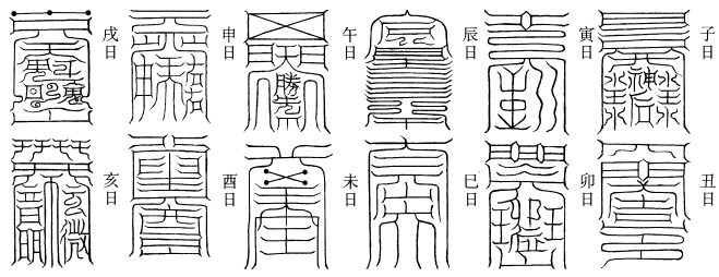 右符二十二道,按日辰,背面书之。假如甲子日见怪,面书甲符,背书子符。凡书符,并斗诀、罡炁、朱书。令见怪人佩带,可格休祥。书符讫,诵灭怪大咒七遍敕之。