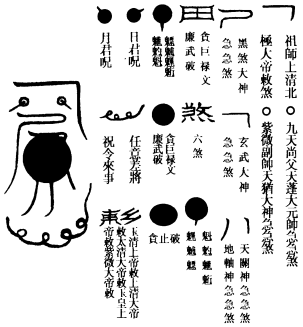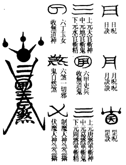 即三光祖符,万法之祖,三界之尊。破灭万邪,保调真炁,不可称述。百千万变,皆此符中出,故作用简易,为万法之宗。每以方寸轻薄纸朱书,每用三道,枣汤吞服。治一切邪祟,名曰伐祟治邪符。
