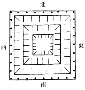 斋坛之制三层:内坛高三尺,方广一丈八尺,上安纂二十枚。中坛高一尺五寸,方广三丈,上安纂二十四枚。外坛以平地为之,方广四丈,安纂二十八枚。三层之外,方广四丈六尺,安花柱三十二枚。三层坛纂,并高一丈一尺。花柱高三尺,用竹为之,涂以朱漆,植于坛边四周方木之上。其方木如坛。每层之木长一丈一尺,厚二寸,阔三寸,凿深窍以安纂柱也。