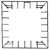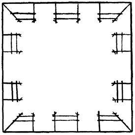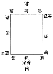 外坛就地面为之,周围各安方木,周植红纂二十八枚。惟正南开一门,余并单纂。纂头刻莲花,门楣上挂牌额。自莲花下三度,以红绳拦之,只留南门不拦。两纂之间,悬彩旛枝花。仍每纂安一灯。离纂挂符旛。并如中层法牌额。惟南门挂于门楣上。余七枚标于单纂莲花下。