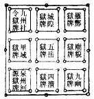 亦用净砂,铺成三涂狱在内,以狱城围之。中安一灯,周设九灯。五苦狱在外,亦以狱城围之,周设十五灯,每处立牌旛如前式。内狱城植天尊号旛八首,外狱城植天尊号旛十六首,并周围设之。