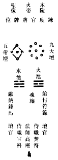 在坛前天井中,露天筑成,三层,如斋坛之制。上层高三尺,坛向天门。法师运神进章取旨,并于坛上行事。