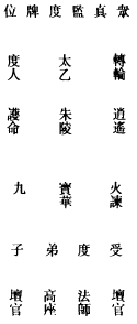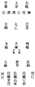 坛上除十方天尊牌位不用,别用九宸牌位:长生,坎。青华,坤。普化,震。雷祖,巽。碧玉,中。洞渊,乾。六波,兑。可韩,艮。采访,离。香花灯烛,供养如法也。