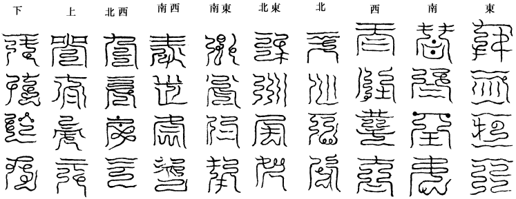 坛纂二十枚,每纂各一符旛,自西北天门为始,左旋。东门用青帛,南赤,西白,北黑,四维黄,上玄下黄,各以所宜色书符。