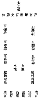 青玄炼度坛,中设太乙像及炼度官吏牌位,其前左右,立箓功、监察、移籍、仙魂、专度、部卫六幕,各设官吏牌位,香花灯烛,供养如法。其水火池,又在六司幕之前,余依科行之。