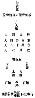 坛内层及中层,并以厚软荐席铺三重,又以彩裀铺其上。内层中列三宝牌位,四周列十方天尊牌位。上方次西北,下方次东南,并左旋。其三宝位高於十方位五寸许,各以香花灯烛,供养如法。三宝位前,悬以五彩宝盖。中层悬青、黄、白三天符旛,次层悬苍、赤、青、绿、黄、白、紫、碧、黑九天符旛,外层悬黄、绿、青、赤、苍、黑、碧、紫、白、黄、绿、青、赤、苍、黑、碧、紫、白、黄、绿、青、赤、苍、黑、碧、紫、白、黄、绿、青、赤、苍三十二天符旛,各以其色帛为之旛。一面书天名,一面书符,符在后。品洞案在三宝前,微斜近右前舒。拜坛法师奏事立班之所也。中层右安磬,知磬主之,左安钟,知炉主之。天门外设安镇三师牌位。若黄箓斋,更添下九方,列于中层。日宫在东北,月宫在西南,星宫在西北,四岳各在其方,中岳在西南,水府在东南。并设牌位,香花灯烛,供养如法。其随朝官,并在中层。左南都讲位,次侍经位,次侍灯位,次坛官。右南监斋位,次侍香位,次坛官。坛官不拘多少,并列其下。直坛立天门外,欲侍直法师故也。