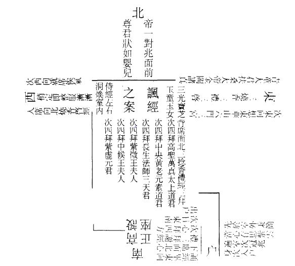 臣某至心上启祖师南极紫真上清道主,太微玉晨圣后,金阙上保东华道君,金阙大夫上清仙侯,臣今入室,诵咏《上清大洞真经三十九章》,愿晨晖焕发,映照臣身,腑藏荣华,灾祸消散,七祖返胎,同驾云舆。