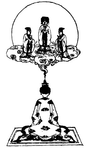 次思月光从兆泥丸中入,兆乃口吸神云,咽津三过,结作三神,一神状如月帝,黄衮冕,二神亦黄衣,侍立,下入绛宫,下真元王下入大肠,出悬于空中,二神入两膀胱,穿两腿髓内,下至涌泉穴,出两脚根,二神各负半月,倒上合于虚中元王,上充腰间车轴之户,合为圆月,月形无穷,映了身形,顺时吐息。