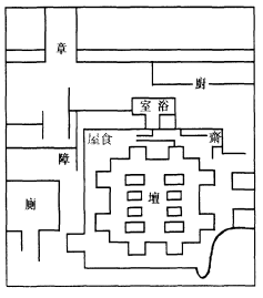 为术之处,置立墙院,或竖柴施栅,但令蒙密,窥不见内,即得充用,院方二十步,若事不得已,宽窄任人。去院内南墙、西墙各四步,置神之室,室令三间,间中丈六。东间壁下,术人地敷铺,头向北舒。中间南向开户。西间南西北三面,各开一户。西间下三面门中,置立神坛,高三寸,积土为之,方八尺,於四面各二阶道。以白墡土,和白草香末,熟捣泥坛,极令香白可爱。比至祭日,令干,不得湿秽,勿令临时不洁。神室东置斋室,大小方丈。神室东西近南角,开门通斋室,以厚席帘之,不用露见。神室之内,又开方尺窗,以纸糊,使室内明了。斋室北又置一室,亦令方丈。斋室北面东角开门,令通此室。此室北面西角通门,拟术人出入。供祭具杂物,悉著此室之中。凡诸室门,兼令有帘有扇,神室宜以箔帘之,余室以席帘之。