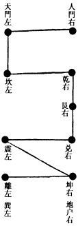 先举左足践离,右足践坤,左足践震,右足践兑,左足从右并作兑。乃先前右足践艮,左足践坎,右足践乾,左足践天门,右足践人门,左足从右足并,在人门上立。然后通气,乃为咒曰: