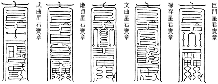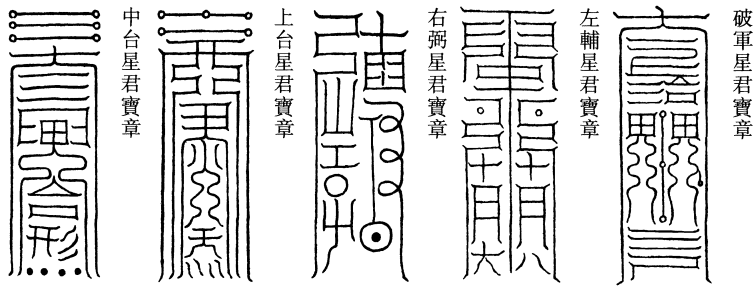 右符,存想尊帝二星,北斗七星,金光朗耀,吸来吹纸上,窍内书玄元始三字,涂九转火笔出向上。