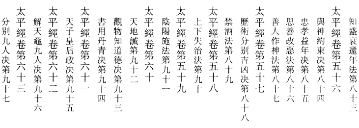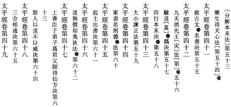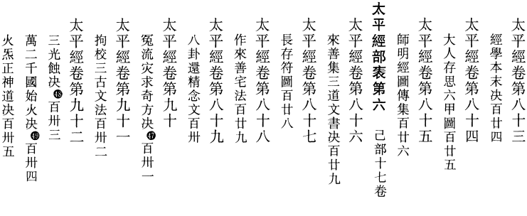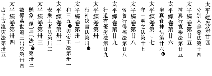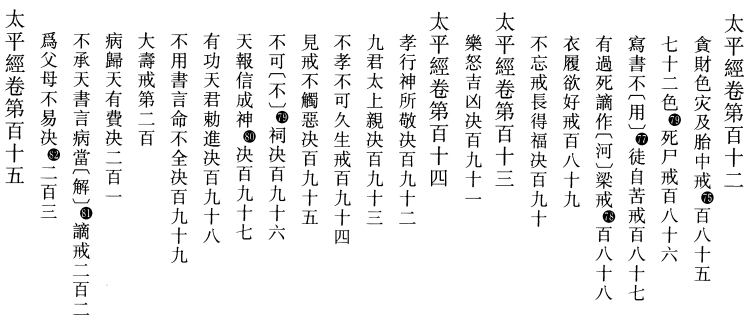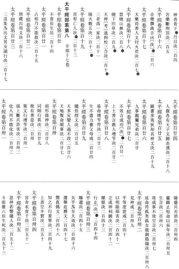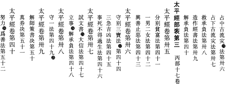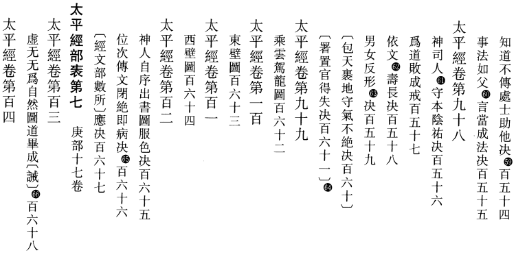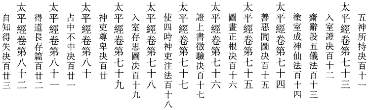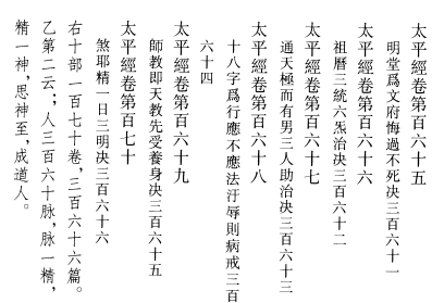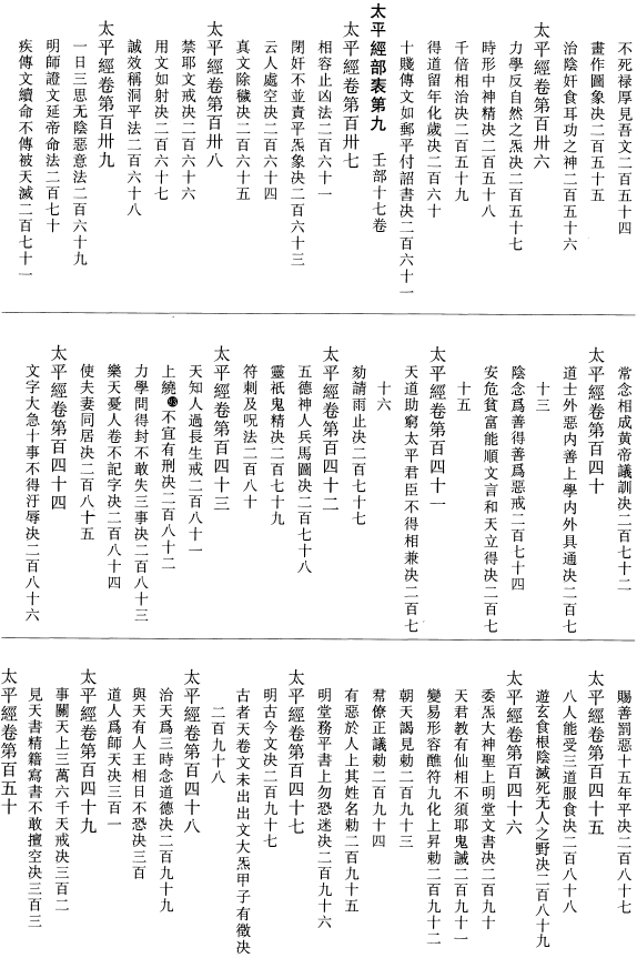《太平经》甲第一云:诵读吾书精之,灾害不得复起。此上古圣贤所以候得失之文也。书有三等,一曰神道书,二曰核事文,三曰浮华记。神道书者,不离实,守本根,与阴阳合,与神同门,核事文者,考核异同,疑误不失。浮华记者,离本已远,错乱不可常用,时时可记,故名浮华记。然则精学之士,务存神道,习用其书,守得其根1。根之本宗,三一为主,一化以三,左无上,右玄老、中太上。太上统和,无上摄阳,玄老捻阴。阴合地,阳合天,和均人。人天及地,号为三刀,各有五德,五德伦分,修事毕,三才复一。得一者生,失-者死。能遵上古之道,则到太平之辰。故曰三老相应,三五燕和,和生生照,梁行无死名也。和则温清调适,适则日月光明,人功既建,天地顺之。故曰先安中五,乃选仙士,贤者心贤,必到圣治。甲第二云:天四五九之道,不可失也。天地失之,万事乱常;五行失之,更相贼伤;四时失之,梁不行人至不行人失之2,身被疾病。守之则吉,失之则伤。三皇常善者,能深用之,审得其意可诫。是其人开,非其人闭,审得其人,可以致寿,可以致乐,可以除耶疾。德薄得之迟,德厚得之速。君子至信乃传道,慎勿付小人。得人则授,不言信誓正当重,不能数遇。遇此经者,皆为真人,所师玄师,无极之神,应感而现,事已即藏。流布叔方,澄清大乱,功高德正,故号太平。圣主善治,谨用兹文,凡君在位,轻忽斯典。羲农之始,莫不奉遵,周汉之终,必也屏弃。《百八十戒序》云:赧王之时,出太平之道,老子至琅那,授与干君。干君得道,拜为真人,作《太平经》。圣人应感出文,述而不作。凡夫弃故,不复识知,缘见维亲,顺情言作耳。帛君笃病,从干君受道,拜为神人。干君讳室,涉乱迁移,易名为吉,寓居东方,往来吴会,周历齐幽,出入伊洛,教训后生,救厄治疾。顺帝之时,弟子宫崇诣阙上书,言师干吉所得神经于曲阳泉上,朱界青首,百有余卷。〔有司〕谓为妖讹,遂不信用。帝君不修太平,其自下潜习,以待后会,贤才君子,密以相传。而世伪人耶,多生因假,矫诡肆愚,疵妨正典。《相尔》云:世多耶巧,托称道云,千端万伎,朱紫盘磷。故记三合以别真,上下二篇法阴阳。复出青领太平文,杂说众要,解童蒙心。复岀五斗米,道备三合,道成契毕,数备三道。虽万恶犹纷,猗公行和,窃号之正目,事乖真实,师之所除。《玄妙内篇》云:吾布杰罢废上清、清约、佛三道,下及干吉太平支散之界百官之神,天地水月三官不正之泉,贪浊受钱饮食之鬼,营传符庙,一切骆驿分罢。夫假称上清受及佛干支离3,偏见执着,自是华炫之耶,皆应摆弃,况号俗神者乎?拾俗4及诸诈文,求真宜寻本旨,案上清、清约、无为佛道。众圣大师,各有本经。干氏本部,自甲之癸,分为十亠表,百七十卷。玄文宕博,妙旨深长,品次源流,条谄如左。