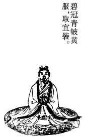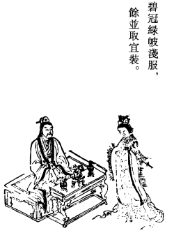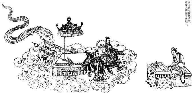 真人碧冠绿帔黄服,车辇人物云彩并取宜