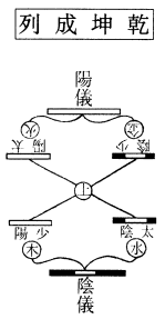 朱子曰:阳仪生奇为太阳,生偶为少阴;阴仪生奇为少阳,生偶为太阴。旧图四象平布,生生不息。今图阳仪下生一奇一偶,为阴阳;阴仪上生一奇一偶,为刚柔。四象圜转,循环不穷;刚交於阴,阴交於刚;阳交於柔,柔交於阳;上下左右相交,而万物生焉。周子曰:阳变阴合,而生水、火、木、金、土,五气顺布,四时行焉。《传》曰:立天之道曰阴与阳,立地之道曰柔与刚。此之谓也。