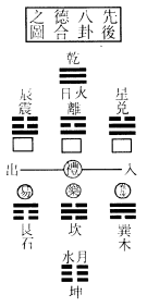 右本前四象生八卦图,而左右四卦易位。乾、离、坎、坤居中,头、目、心、腹之象;震、艮、巽、兑居左右,手、足、股、肱之象。希夷先生以为形类合。盖人者,天地之合气也。惟皇降衷,若有恒性,故凡言道学者,皆原於此。《杂卦》云:乾刚坤柔,离上坎下,兑见巽伏,震起艮止。稽此而言。《参同契》云:乾坤者,易之门户,众卦之父母。坎离匡郭,运毂正轴。牝牡四卦,以为橐籥。亦为有得於此。今故表而传焉。