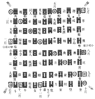 《周易参同契》曰:朔旦为复䷗,阳气始通。出入无疾,立表微刚。黄钟建子,兆乃滋彰。播施柔暖,藜蒸得常。䷒临炉施条,开路正光。光耀浸进,日以益长。丑之大吕,结正低昂。仰以成䷊泰,刚柔并隆。阴阳交接,小往大来。辐凑於寅,运而趍时。渐历䷡大壮,侠列卯门。榆荚堕落,还归本根。刑德相负,昼夜始分。䷪夬阴以退,阳升而前。洗濯羽翮,振索宿尘。䷀乾健盛明,广被四邻。阳终於巳,终而相干。䷫姤始纪绪,履霜最先。井底寒泉,午为蕤宾。宾服於阴,阴为主人。䷠遁去世位,收敛其精。怀德竢时,栖迟昧冥。䷋否闭不通,萌者不生。阴伸阳诎,没阳姓名。䷓观其耀景,察仲秋情。任蓄微稚,老枯复荣。荠麦牙蘗,同冒以生。䷖剥烂支体,消灭其形。化气既竭,亡失至神。道穷则反,归乎䷁坤元。恒顺地理,承天布宣。玄幽远眇,隔阂相连。应度育种,阴阳之原。寥廓恍惚,莫知其端。先迷失轨,后为主君。无平不陂,道之自然。变易更盛,消息相因。终坤始复,如循连环。帝王承御,千秋常存。邵子《大易吟》曰:天地定位,否、泰反类;山泽通气,损、咸见义;雷风相薄,恒、益起意;水火相射,既济、未济。四象相交,成十六事;八卦相重,为六十四。朱子谓此释方图两交股底卦,东南角乾,便对西北角坤,旧作东南角坤,便封西北角乾。天地定位也。西南角否,对东北角泰,否、泰反类也。不知怎生恁地巧。新安程氏直方曰:邵子云先天学,心法也,图皆从中起,万化万事生於心也。曰皆者,兼方圆图而言也。天地定位,圆图从中起也。雷动风散,方图从中起也。圆者动,以定位为本;方者静,以动散为用。动而无动,静而无静,固先天之心法与。
