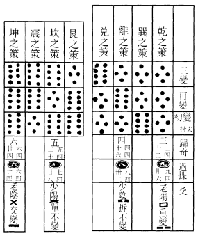 右蓍四十有九策,分而为二以象两仪,而挂置一策於中以象人,左右策四十有八,盖总卦爻之实也。八卦经画二十有四,重之则为四十有八;又每卦各八变,其爻亦四十有八也。其揲法先以左手取左半之策握之,而以右手取右半一策挂置于中,而不复动,以象人居天地之中;其阴阳、寒暑、昼夜、变化一听于天,而无与焉。一虽无与,而常与四十有八者并用。参为三才者也。次以右手四揲左手之策而归其奇,或一或二、或三或四,於小指、次指之间,谓之扐,象三年一闰。又以右手取右半之策,余一2取三,余三取一,余二取六,余四取四,归於次指、中指之间,谓之再扐,象五年再闰。而后挂者,谓总所归二奇置於挂之一所,如挂一法,《韵会》曰合而置之是也。其归奇之数,不四则八,无所谓不五则九。得四为奇,一个四也。得八为偶。两个四也。於是复合过揲之策,或四十四,或四十,分、揲、归、挂如前法,为第二变。又合所余过揲之策,或四十,或三十六,或三十二,分、揲、归、挂亦如前法,为第三变。三变之后,然后视其所挂之策,得三奇为老阳,三偶为老阴。两偶一奇,以奇为主,为少阳;两奇一偶,以偶为主,为少阴。每三变而成一爻,十有八变而成一卦;一卦可变而为六十四卦,而四千九十六卦在其中矣。