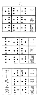 右三变皆奇,为老阳,乾之策者八。归扐得十二策,过揲得三十六策,以四约之,归扐得三,三个四,过揲得九,九个四,九者,阳之极,变而为阴。《易》以变为占,凡阳爻之变者,通谓之九。