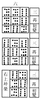右三变皆偶,为老阴,坤之策者八。归扐得二十四策,过揲亦得二十四策,以四约之,归扐得六,六个四,过揲亦得六,六个四,六者,阴之极,变而为阳。《易》以变为占,凡阴爻之变者,通谓之六。