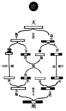 《传》曰:昔者圣人之作《易》也,将以顺性命之理,是以立天之道曰阴与阳,立地之道曰柔与刚,立人之道曰仁与义,兼三才而两之,故《易》六画而成卦。分阴分阳,迭用柔刚,故《易》六位而成章。右图天之阴阳,分而为乾、兑、离、震;地之柔刚,分而为坤、艮、坎、巽;合两仪、四象、八卦为六位。上下左右相交,乾下交坤,巽上交震,离下交坎,艮上交兑,而人当其气交之中,禀天地、四象、八卦之气以成形,而理亦赋焉。头圆居上得之乾,腹虚有容得之坤,股肱动作得之震、巽;离目主视,坎耳善听,兑口能言,艮鼻处嘿,目、口,阳也,得天之气,故动。耳、鼻,阴也,得地之气,故静。所谓得是气而为是形也。知效天之阳,於卦为坎;水主知。仁效天之阴,於卦为艮;山主仁。礼法地之柔,於卦为离;火主礼。义法地之刚,於卦为兑,金主义。所谓得是理而为是性也。夫既有是形,具是理,亦不能无是欲。目之於色,耳之於声,口之於味,鼻之於臭,四肢之於安佚,欲动情胜,爱恶相攻,而吉凶生於是。圣人顺性命之理,作《易》教人以崇其德,以广其业。仰观日、月、星、辰之象、寒、暑、昼、夜之变;俯察山、川、草、木之形,水、火、土、石之化。雨露风霆,游气纷扰,肖翘飞走,庶物流形,上下往来,升降否泰,由是协之以五纪,正之以五事,若《易》、《书》、《诗》、《春秋》、《礼》、《乐》者,圣人之所以弥纶天地之道,而参赞化育者也。